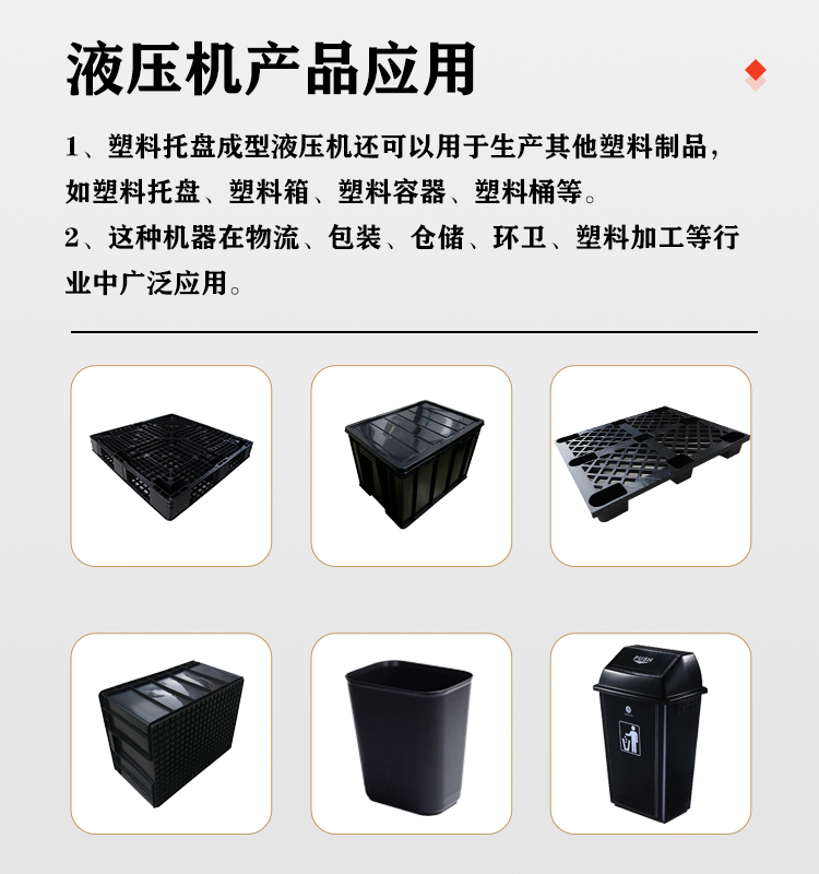 塑料托盤成型液壓機(jī)在物流、倉(cāng)儲(chǔ)、包裝等行業(yè)中有著廣泛的應(yīng)用。塑料托盤是一種常用的物流包裝工具,可以用于存放、運(yùn)輸和堆放貨物,提高物流效率,降低勞動(dòng)強(qiáng)度。塑料托盤成型液壓機(jī)生產(chǎn)的塑料托盤具有質(zhì)量穩(wěn)定、耐用、環(huán)保等優(yōu)點(diǎn),能夠滿足不同行業(yè)的需求。在電子、汽車、食品、化工等行業(yè)中,塑料托盤都是必不可少的物流包裝工具,因此塑料托盤成型液壓機(jī)在這些行業(yè)中具有重要的應(yīng)用價(jià)值。