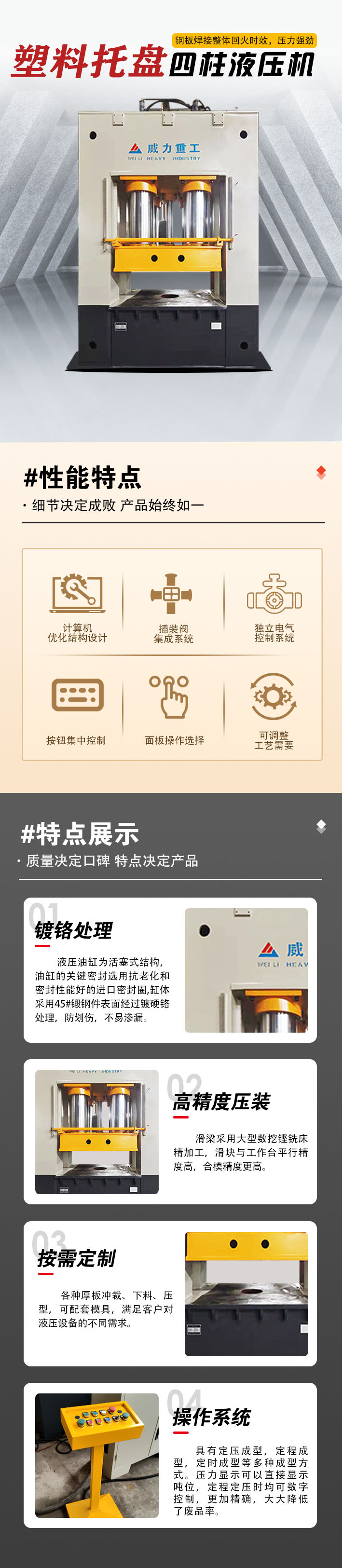 【產(chǎn)品描述】:塑料托盤成型液壓機(jī)是一種專門用于生產(chǎn)塑料托盤的設(shè)備。它采用液壓系統(tǒng),通過(guò)將熔化的塑料注入模具中,然后施加高壓力進(jìn)行成型,最終得到塑料托盤產(chǎn)品。這種機(jī)器具有高效、精準(zhǔn)、穩(wěn)定的特點(diǎn),能夠生產(chǎn)出高質(zhì)量的塑料托盤。 塑料托盤成型液壓機(jī)在物流、倉(cāng)儲(chǔ)、包裝等行業(yè)中有著廣泛的應(yīng)用。塑料托盤是一種常用的物流包裝工具,可以用于存放、運(yùn)輸和堆放貨物,提高