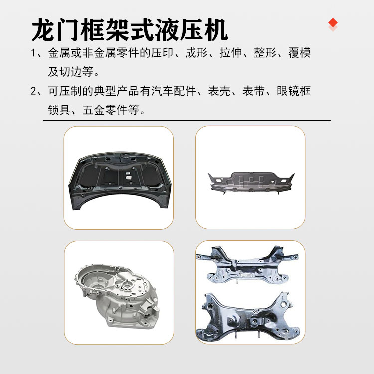 【產(chǎn)品描述】:30噸龍門框架式液壓機(jī)是一種高效、精準(zhǔn)的壓力成型設(shè)備,廣泛應(yīng)用于各種金屬、非金屬材料的壓制、成型和校正工藝中。其獨(dú)特的龍門框架設(shè)計(jì)和強(qiáng)大的液壓驅(qū)動系統(tǒng),使其具有出色的穩(wěn)定性和工作效率,成為現(xiàn)代工業(yè)生產(chǎn)中不可或缺的重要設(shè)備。 30噸龍門框架式液壓機(jī)采用高強(qiáng)度鋼材構(gòu)建龍門式框架,保證了設(shè)備的穩(wěn)固性和剛性。機(jī)身采用優(yōu)質(zhì)鋼板焊接而成,經(jīng)過精細(xì)的熱處