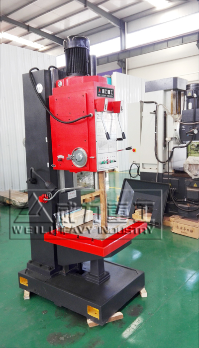 【產(chǎn)品描述】:立式鉆床 主軸豎直布置且中心位置固定的鉆床,簡(jiǎn)稱立鉆。常用于 機(jī)械制造和修配工廠加工中、小型工件的孔。 立式鉆床加工前,須先調(diào)整工件在工作臺(tái)上的位置,使被加工孔中心線對(duì)準(zhǔn)刀具軸線。加工時(shí),工件固定不動(dòng),主軸在套筒中旋轉(zhuǎn)并與套筒一起作軸向進(jìn)給。工作臺(tái)和主軸箱可沿立柱導(dǎo)軌調(diào)整位置,以適應(yīng)不同高度的工件。 立式鉆床作為鉆床的一種,也是比較常見(jiàn)的